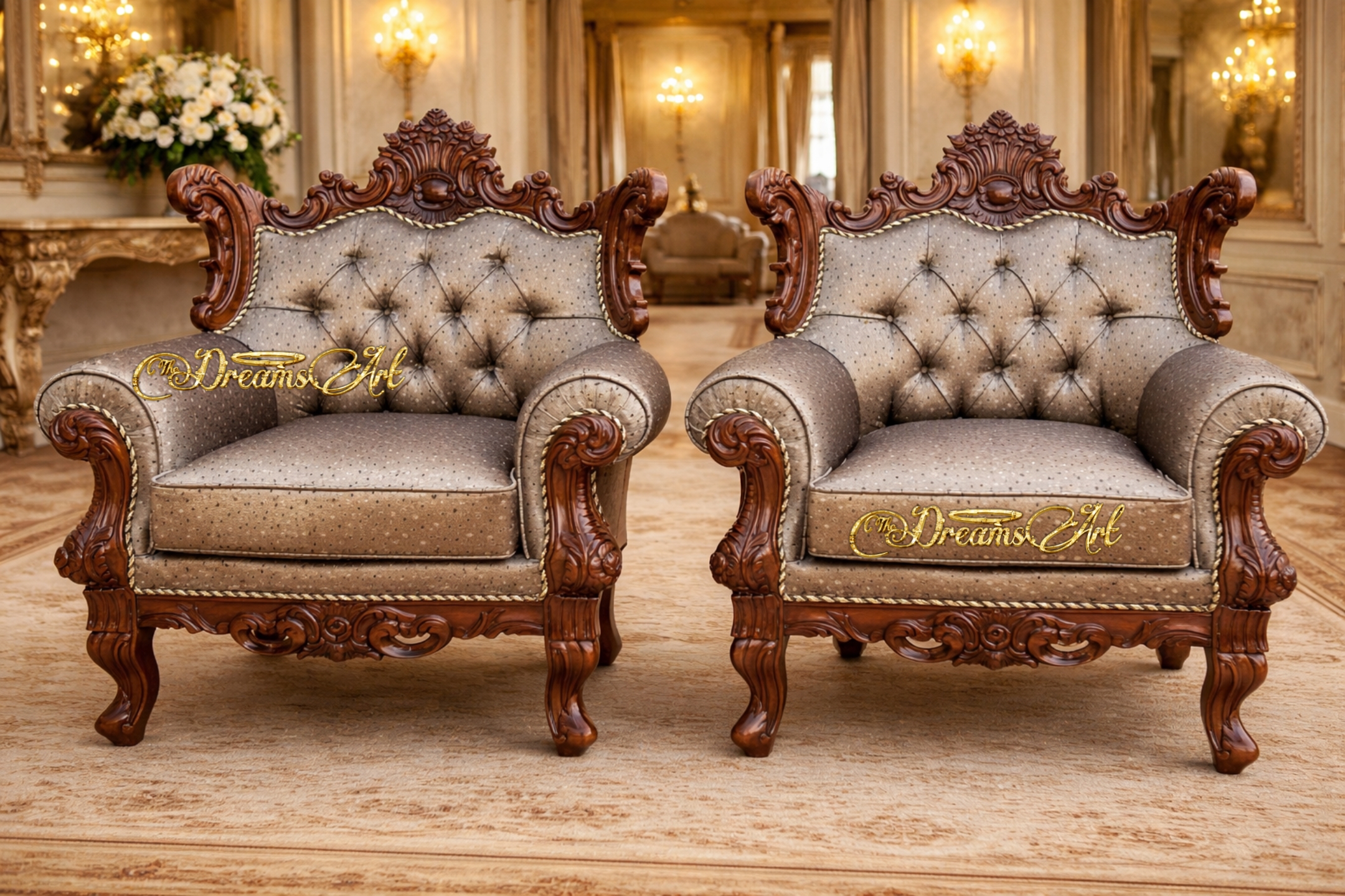 The Maharaja Crest Royale Hand-Carved Luxury Sofa 3+1+1+ is a magnificent blend of regal artistry and supreme comfort, crafted for those who appreciate timeless royal elegance. Made from premium quality solid wood, this sofa features masterfully hand-carved detailing along the crown, arms, base, and legs, inspired by classic palace furniture.