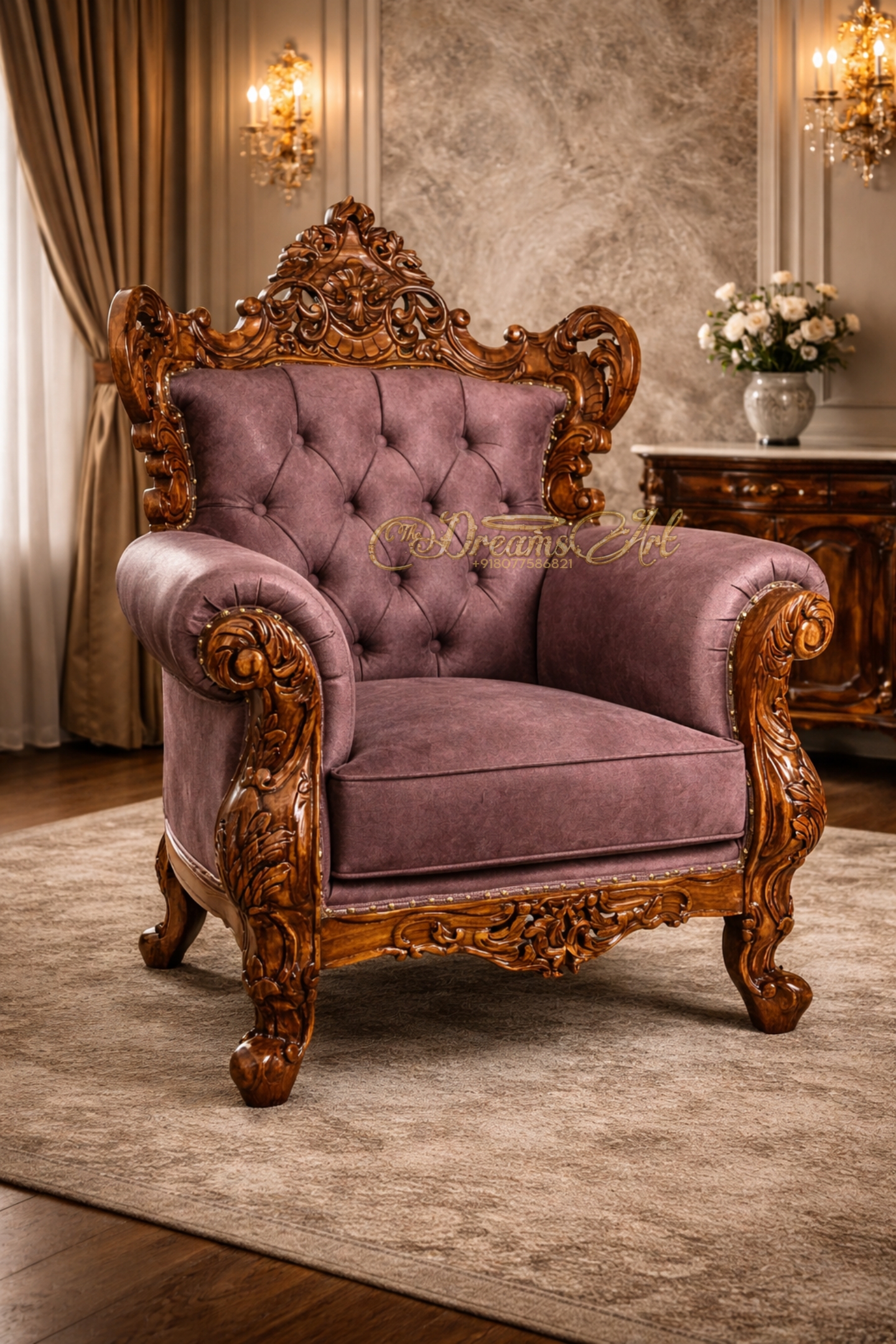 Upholstered in plush tufted velvet, the generously cushioned seat and backrest provide exceptional comfort while maintaining a refined, aristocratic presence. The rich natural wood polish enhances the carving depth, creating a perfect harmony between craftsmanship and comfort.