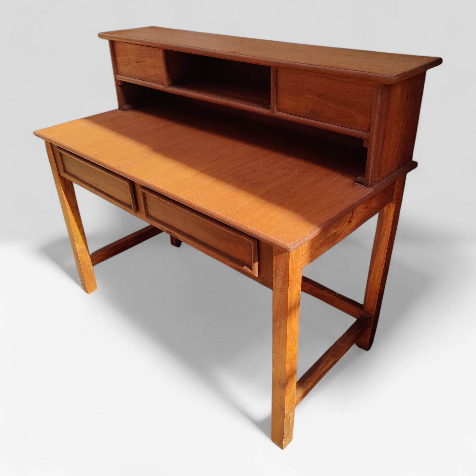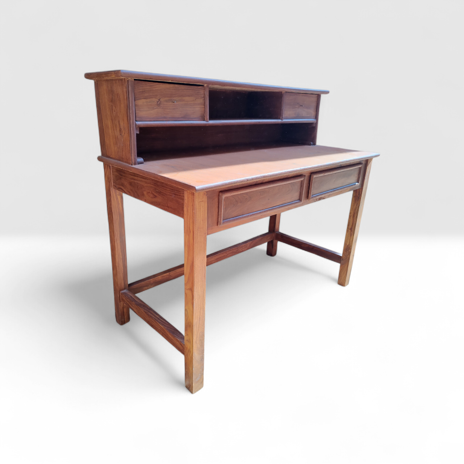 Designed for both beauty and function, it features a spacious writing surface, smoothly finished drawers for organized storage, and an integrated upper shelf ideal for books, décor, or essentials. The subtle detailing and balanced proportions make it perfect for luxury home offices, heritage studies, boutique libraries, and executive workspaces.