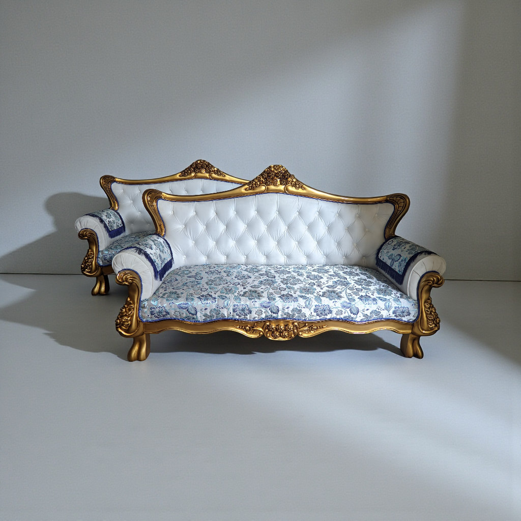 The Maharaja Azure Royale Hand-Carved Sofa 3+3 is a timeless expression of royal Indian craftsmanship, designed for interiors that demand elegance, heritage, and prestige. Hand-crafted by master artisans, this luxurious sofa features an exquisitely carved wooden frame finished in rich antique gold polish, inspired by palace-era royal furniture.