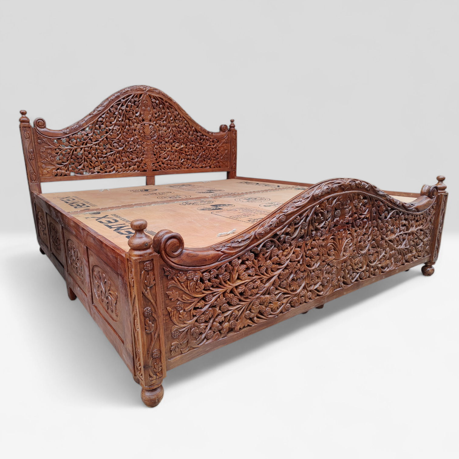 A royal hand-carved solid wood bed featuring intricate floral carvings and a heritage finish, designed for luxurious palace-style bedrooms.