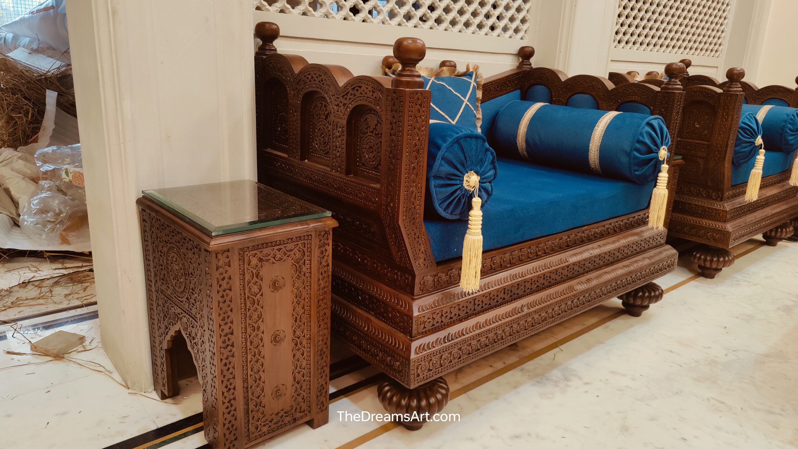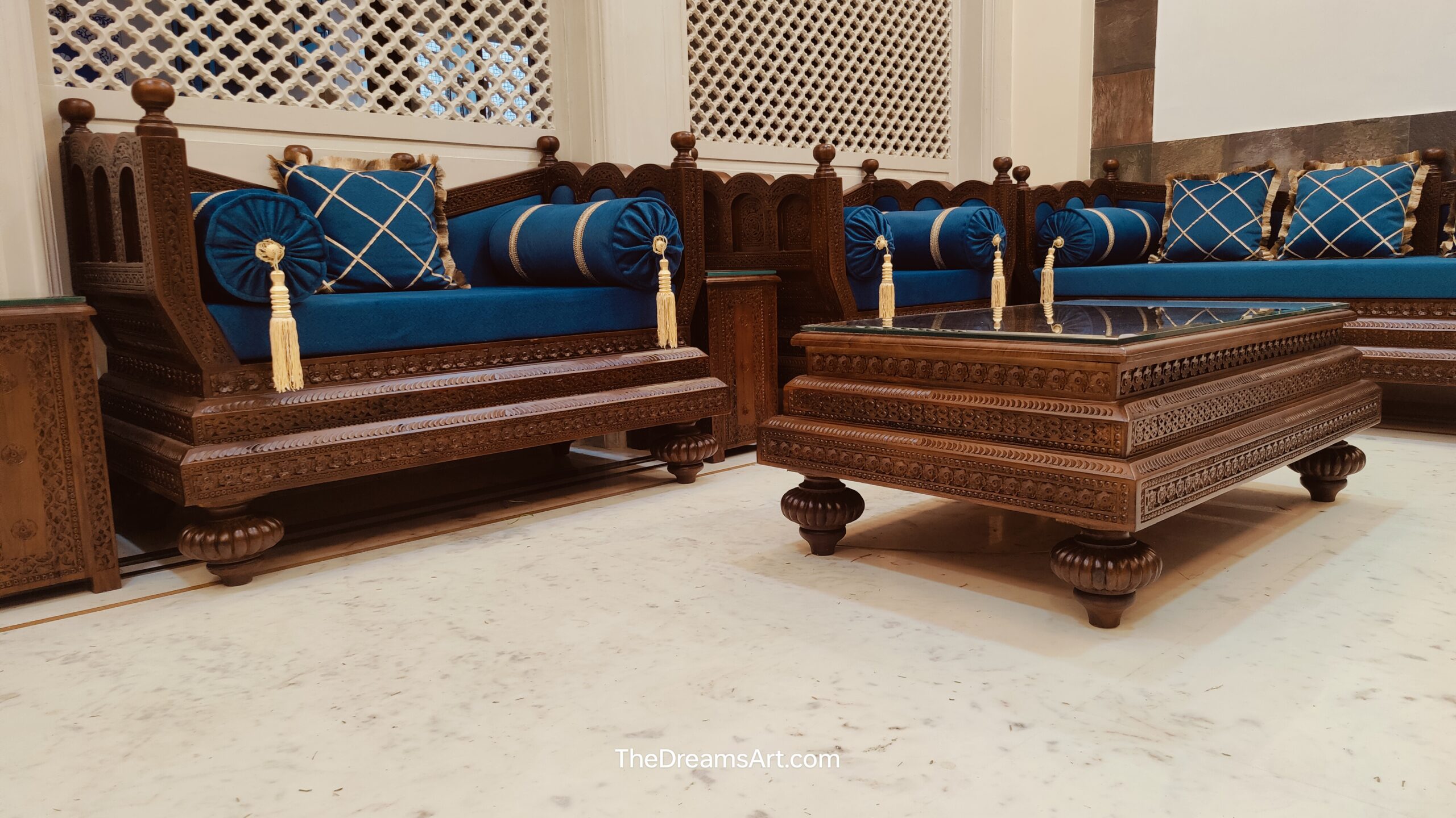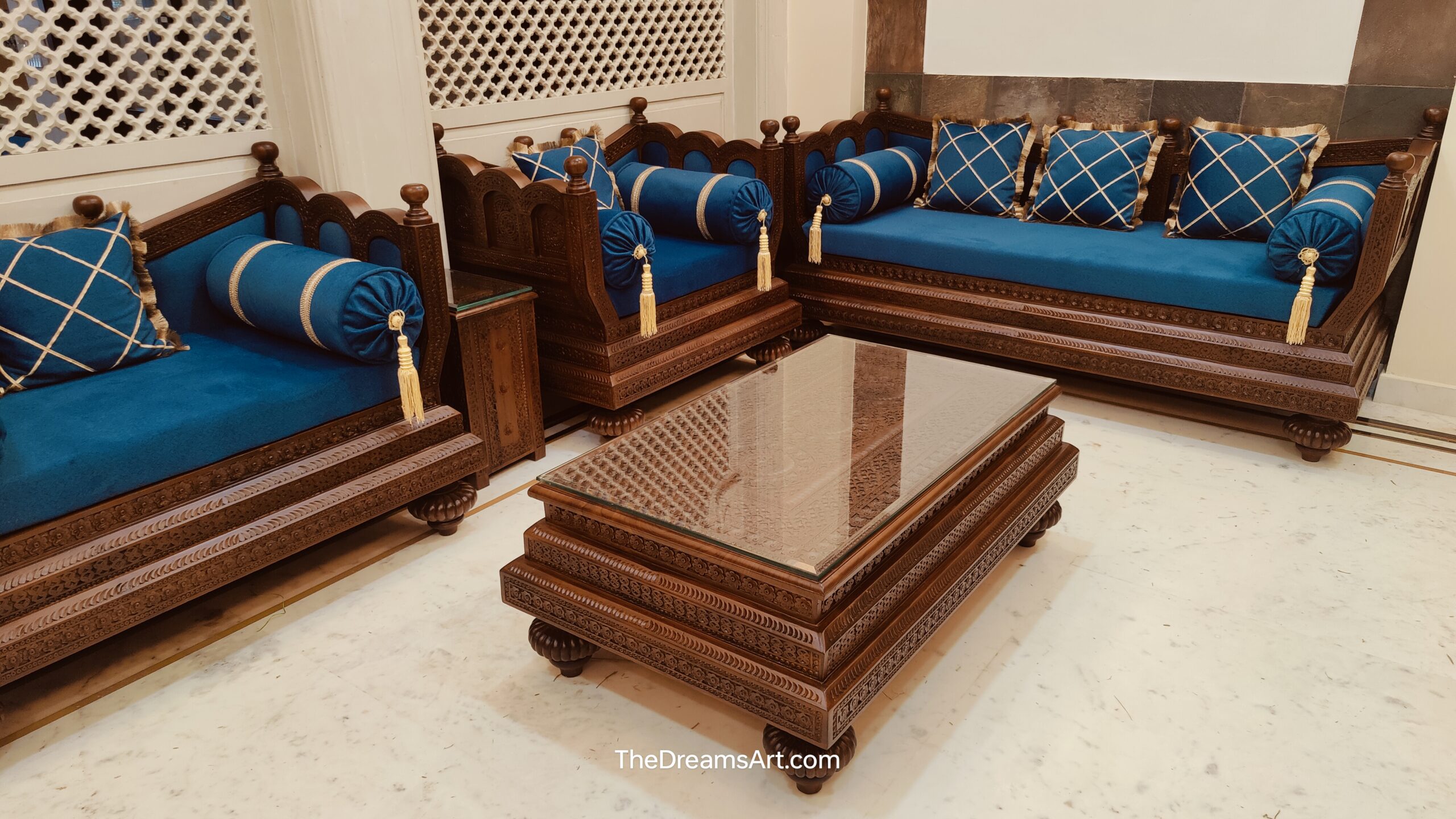 Completed with a matching hand-carved wooden center table with a glass top, this masterpiece brings culture, craftsmanship, and comfort into one royal ensemble.