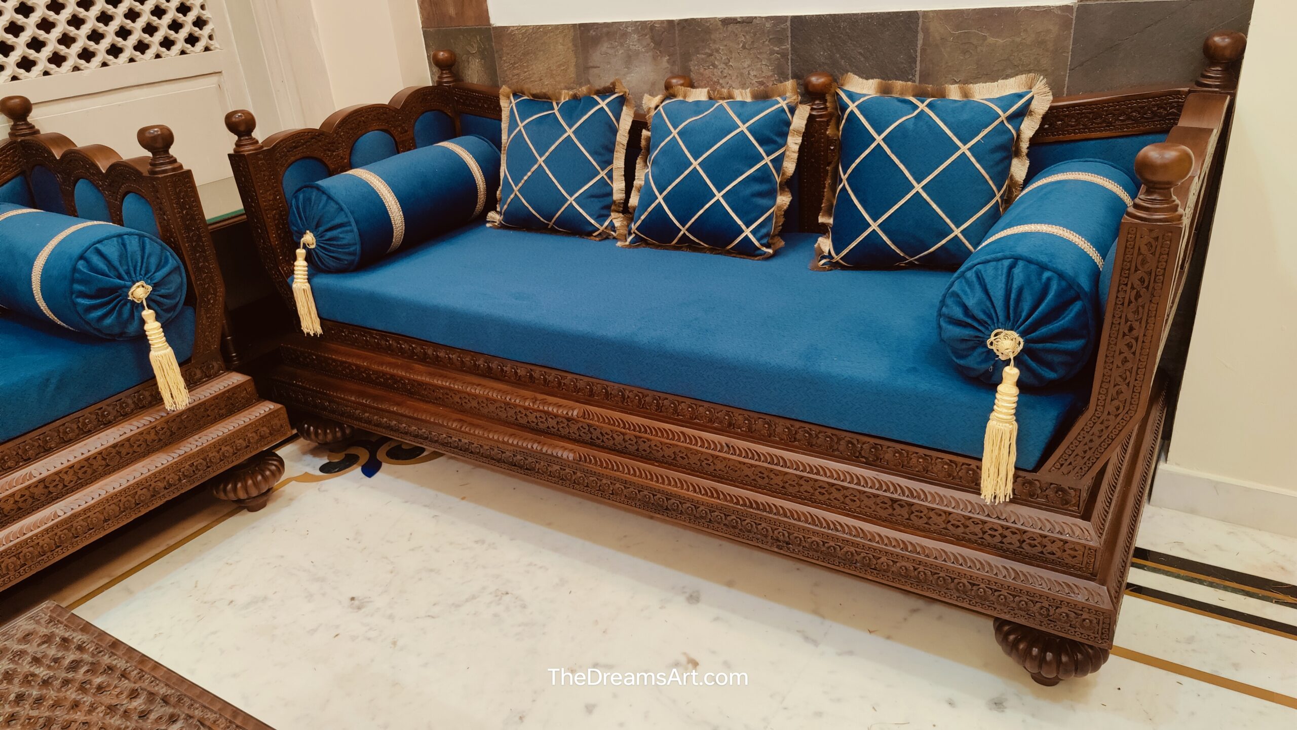 The rich upholstery, paired with elegant bolster cushions and detailed tassels, enhances both comfort and regal appeal. Every curve, motif, and carving is carefully executed by skilled artisans, making this sofa set a perfect statement for luxury living rooms, heritage villas, and palace-inspired interiors.