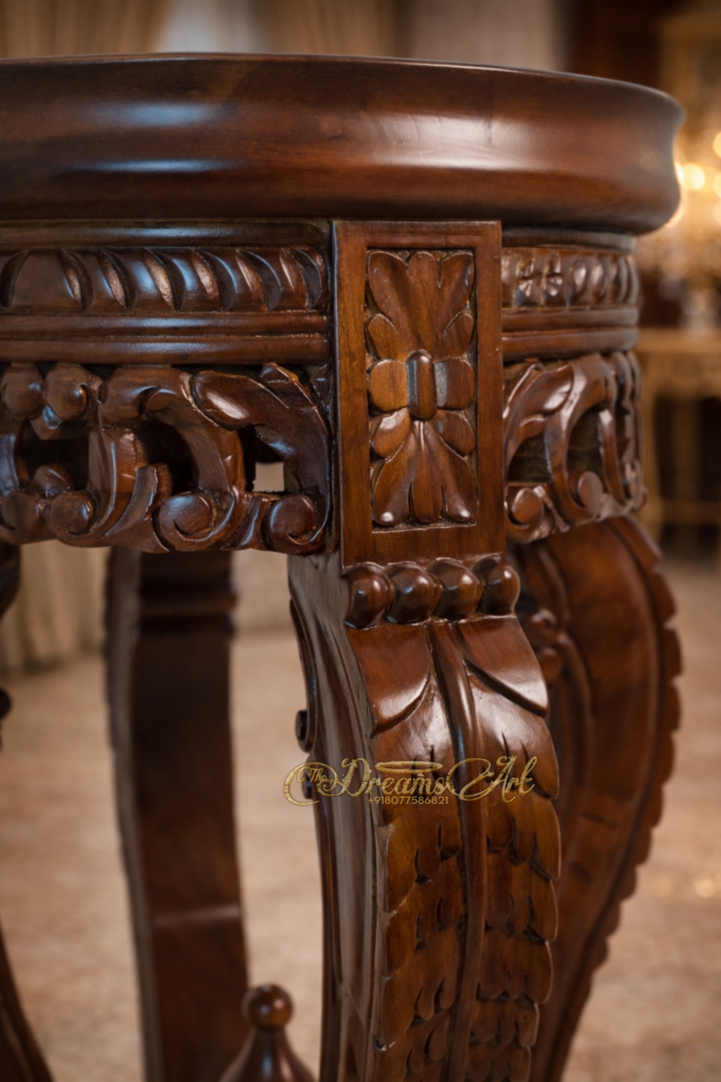A luxury hand-carved solid wood pedestal table with intricate detailing and rich polish, perfect for classic and royal interiors.