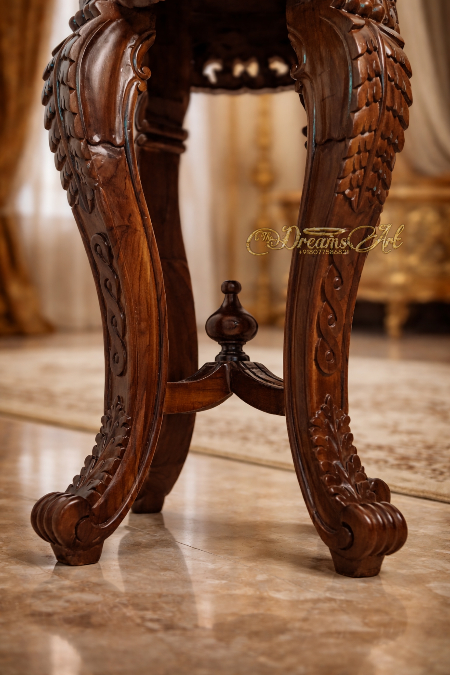 The rich natural polish enhances the depth of the wood grain while highlighting every carved detail—from the decorative apron to the elegant curved feet. Compact yet commanding, the Aurelius is designed to elevate luxury living rooms, bedrooms, foyers, and heritage-inspired interiors.