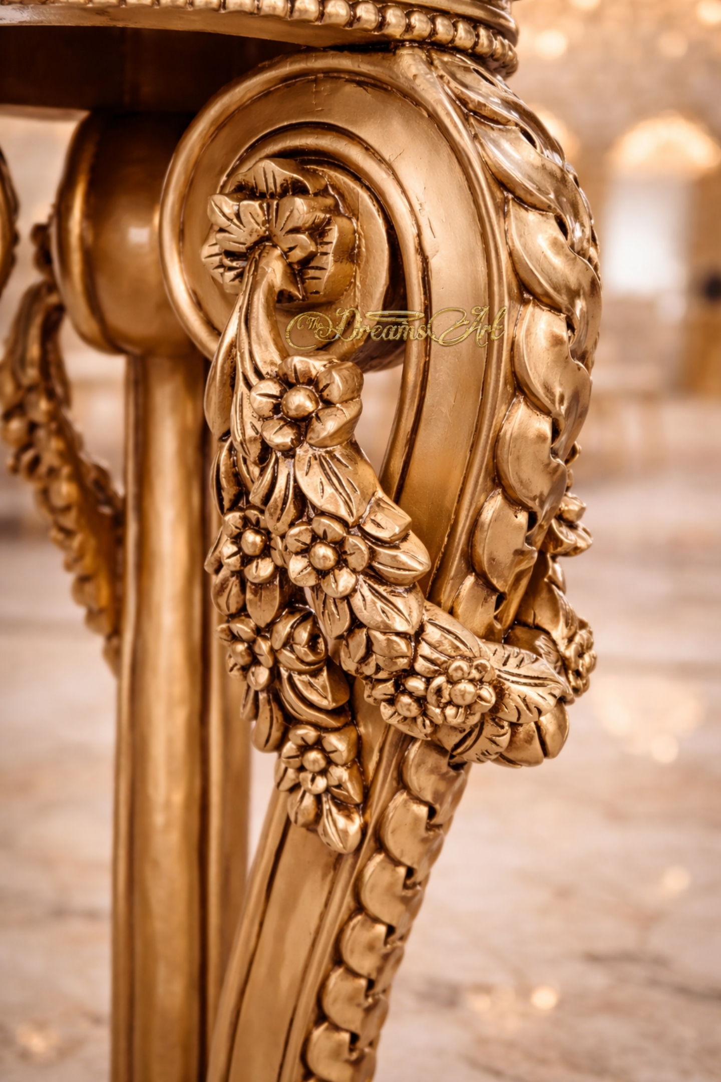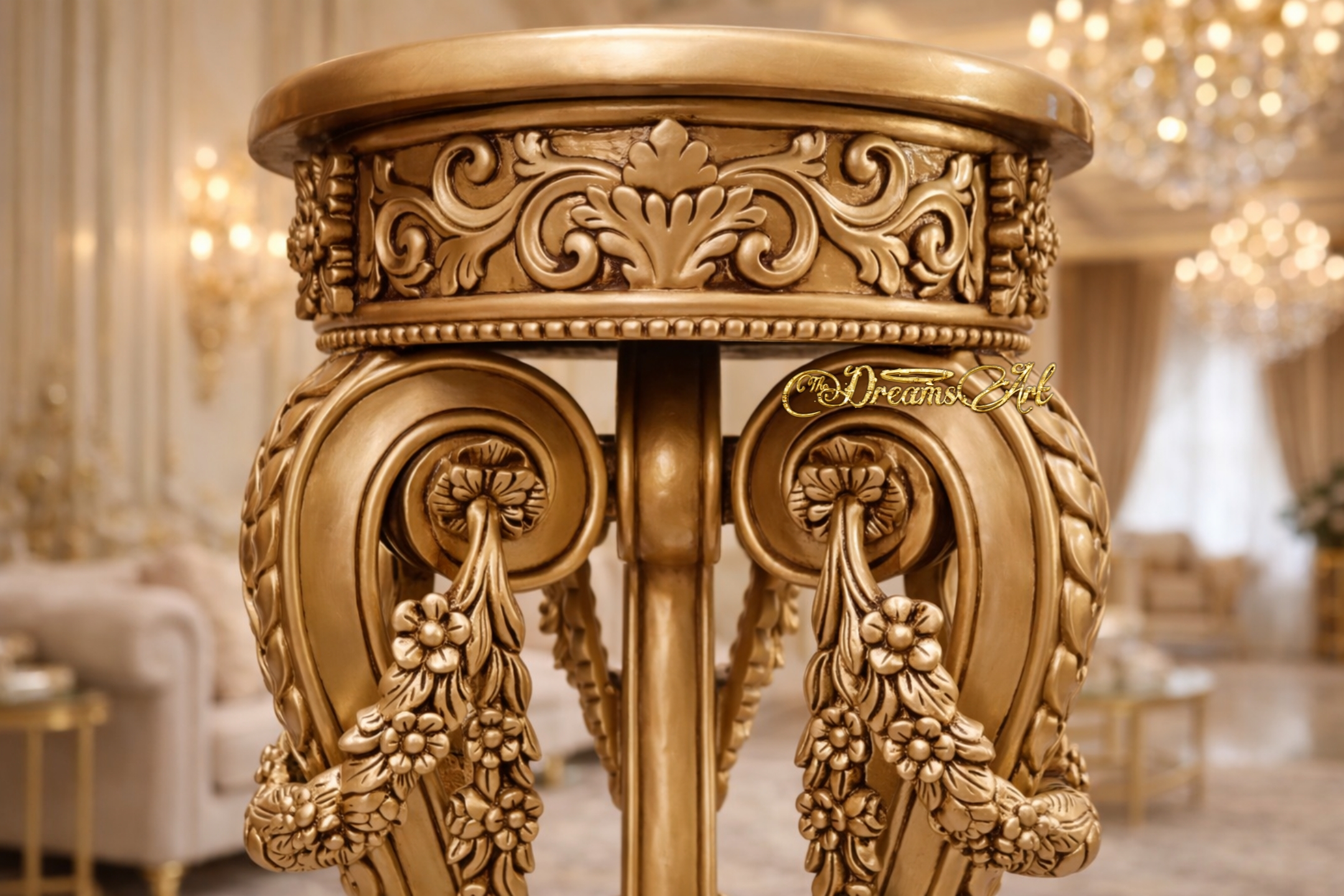 Elevate your interior to the realms of royalty with the Aurum Majesty Hand-Carved Pedestal, an exquisite masterpiece from The Dreams Art Furnitures. This pedestal is a testament to timeless craftsmanship, featuring intricate floral reliefs and neoclassical scrollwork meticulously hand-carved by master artisans. Finished in a rich, multi-tonal antique gold leaf, it captures and reflects light to create a warm, opulent ambiance in any room. Whether used to display a prized marble bust, a rare vase, or as a standalone statement piece, this pedestal brings a sense of grand architectural heritage to the modern luxury home. Its robust tripod base ensures stability without sacrificing the fluid, graceful lines that define high-end bespoke furniture.