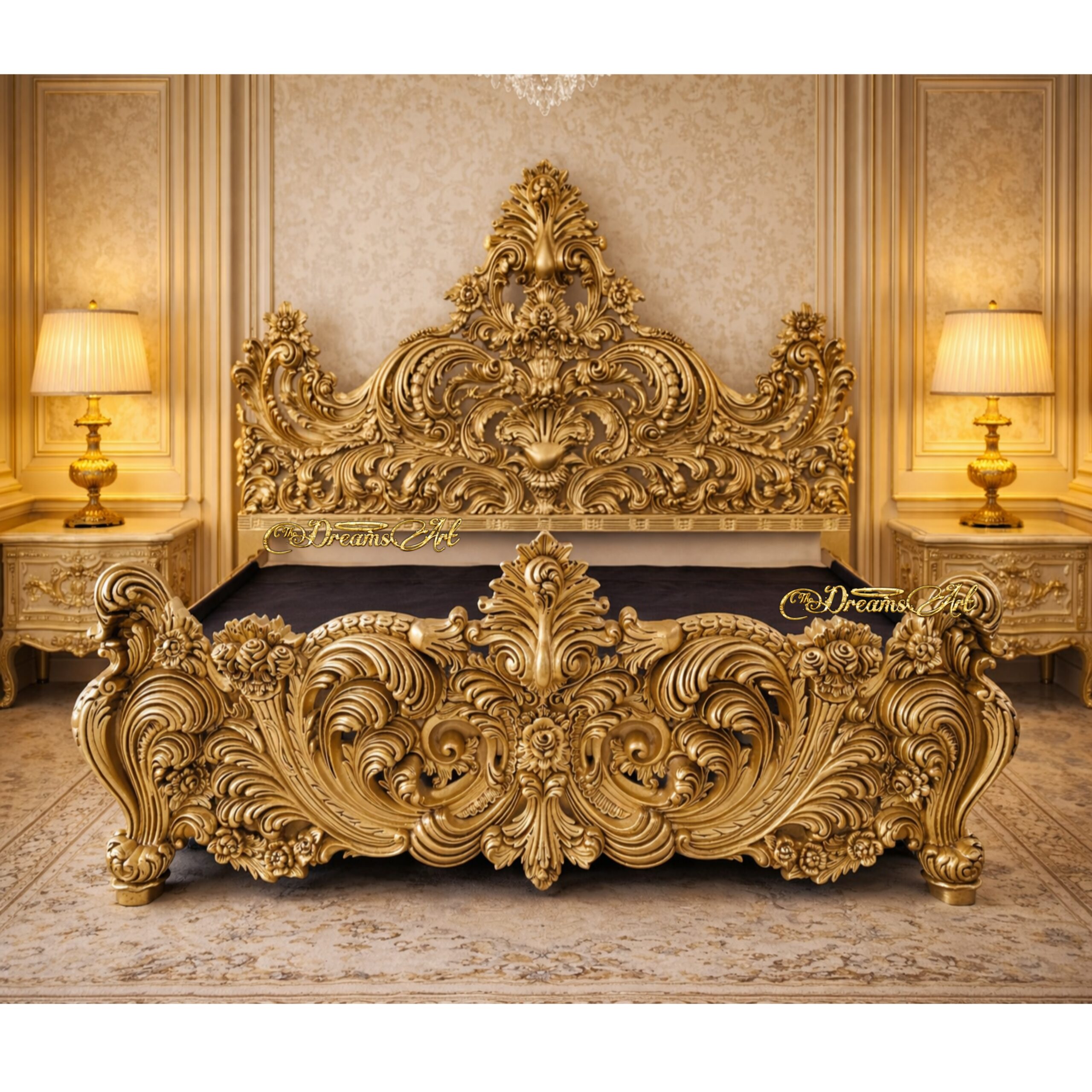 A majestic hand-carved royal bed in antique gold finish, crafted for palace-style luxury bedrooms.