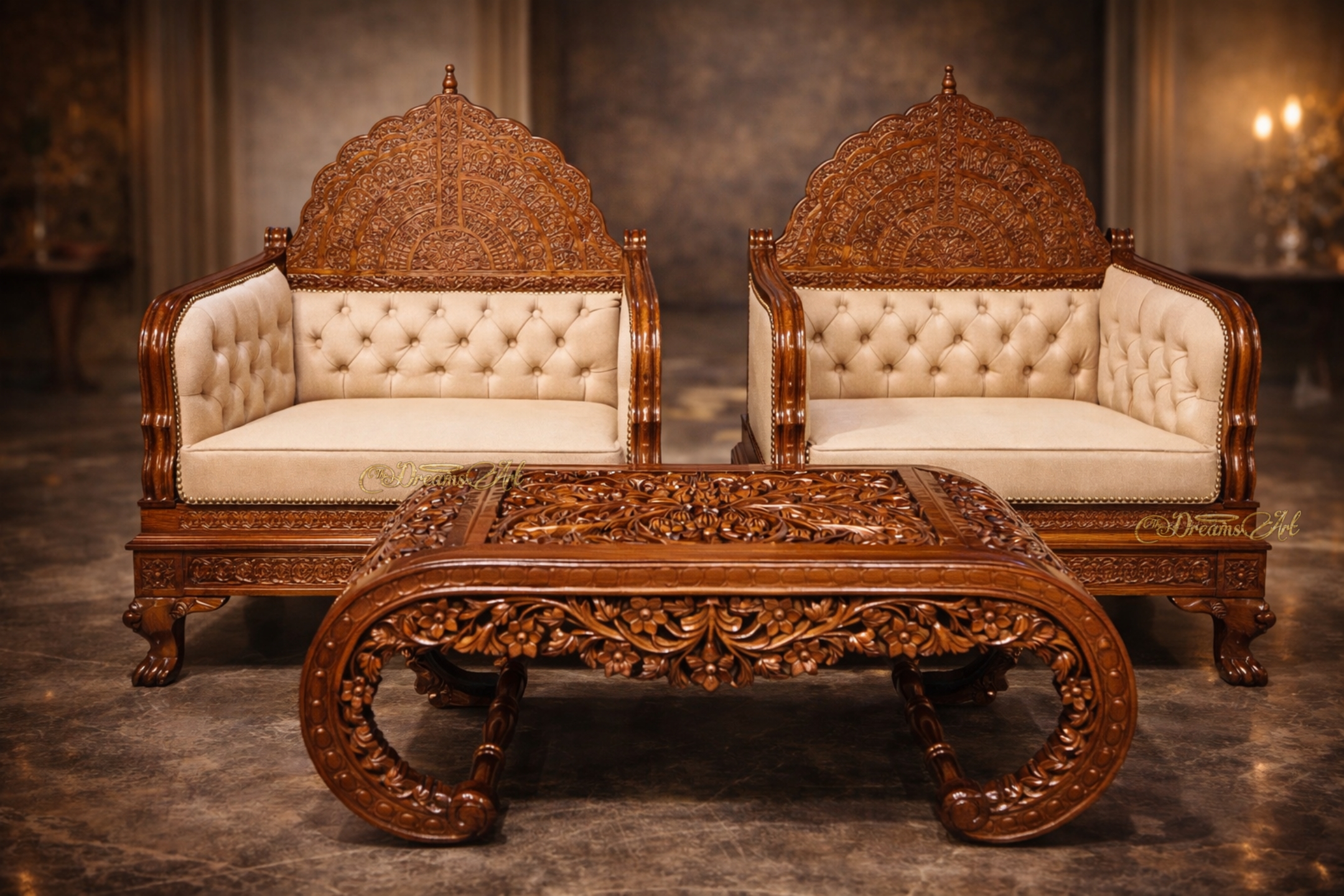 The high arched backrests are adorned with intricate floral and geometric carvings inspired by Mughal-era design, while the solid wood frames showcase deep hand-carved detailing across every surface. Upholstered in soft ivory tufted fabric, the seating offers a plush and refined experience, perfectly balancing comfort with heritage aesthetics.