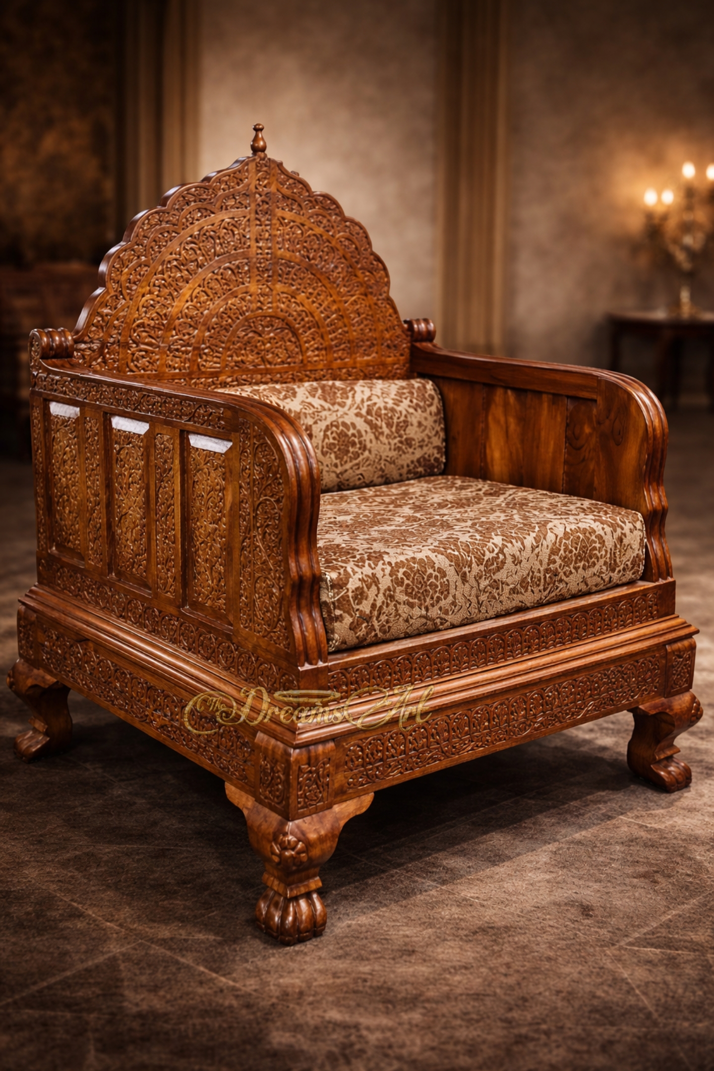 Finished in a rich natural wood polish, this diwan set is ideal for luxury living rooms, palace-style interiors, heritage homes, boutique hotels, and royal lounges. Every piece reflects patience, precision, and generations of carving expertise.