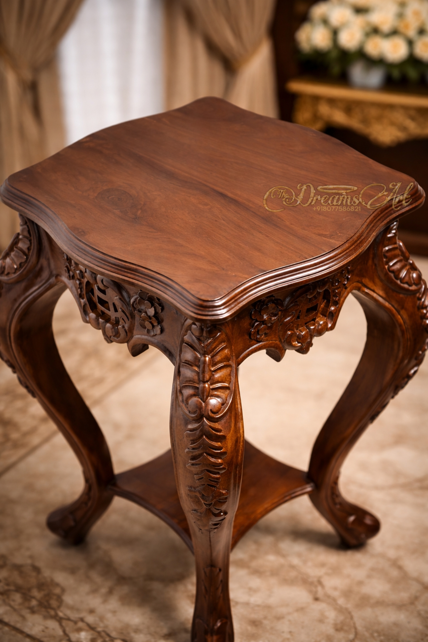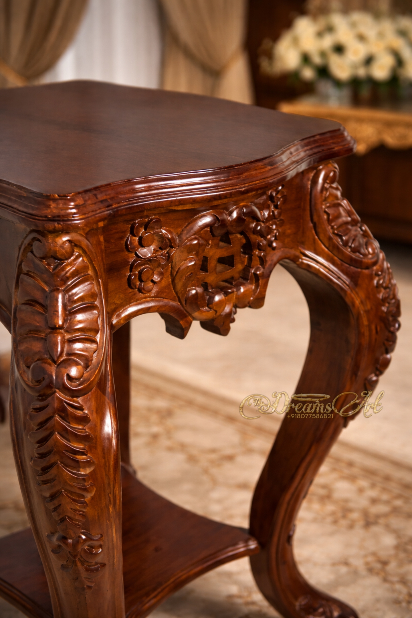 A luxury hand-carved solid wood side table with elegant curved legs and premium polish, ideal for classic and royal interiors.