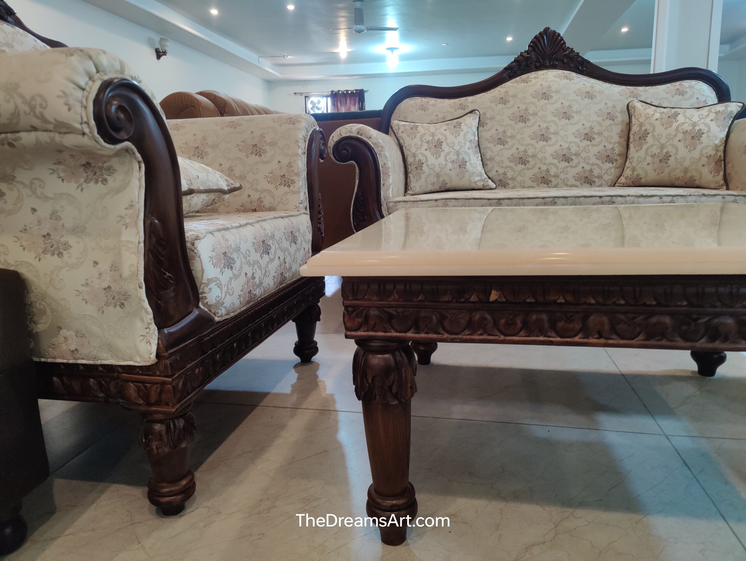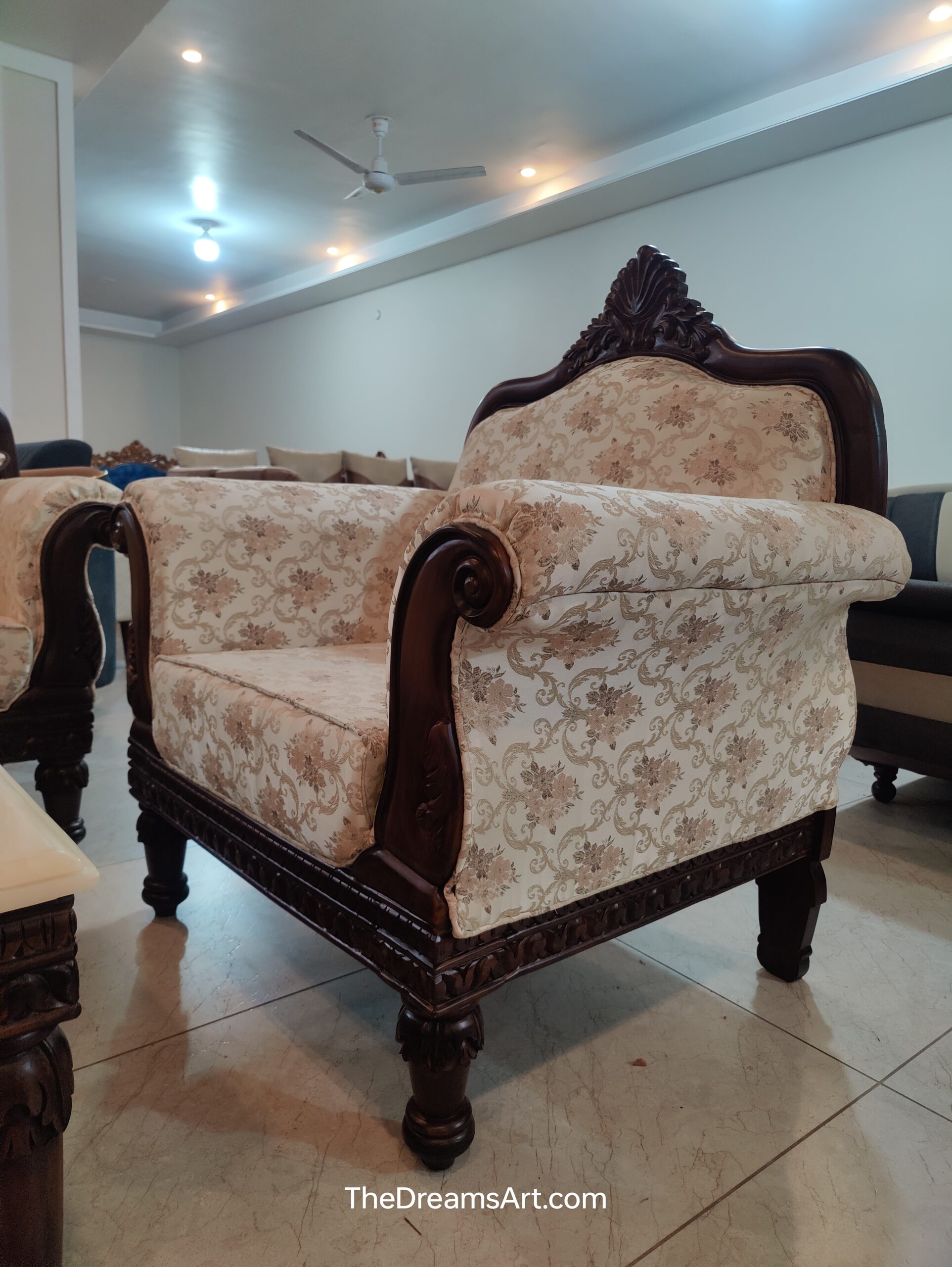 A luxury hand-carved solid wood 3+1+1 sofa set by The Dreams Art Furnitures, featuring elegant floral upholstery and royal detailing for timeless heritage interiors.