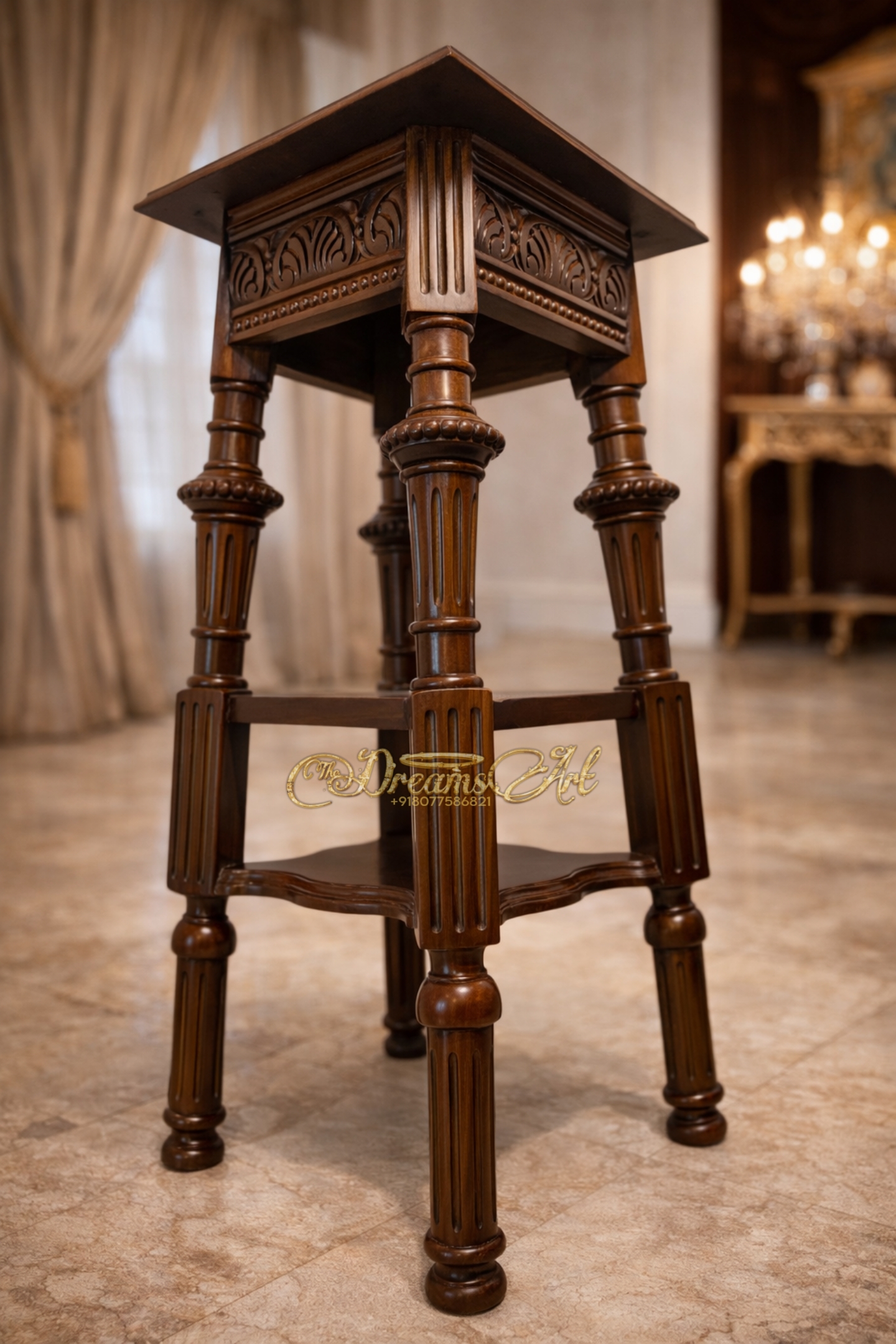 A premium hand-carved solid wood stool with classic detailing, sturdy legs, and a rich polished finish, designed for elegant and heritage-style interiors.