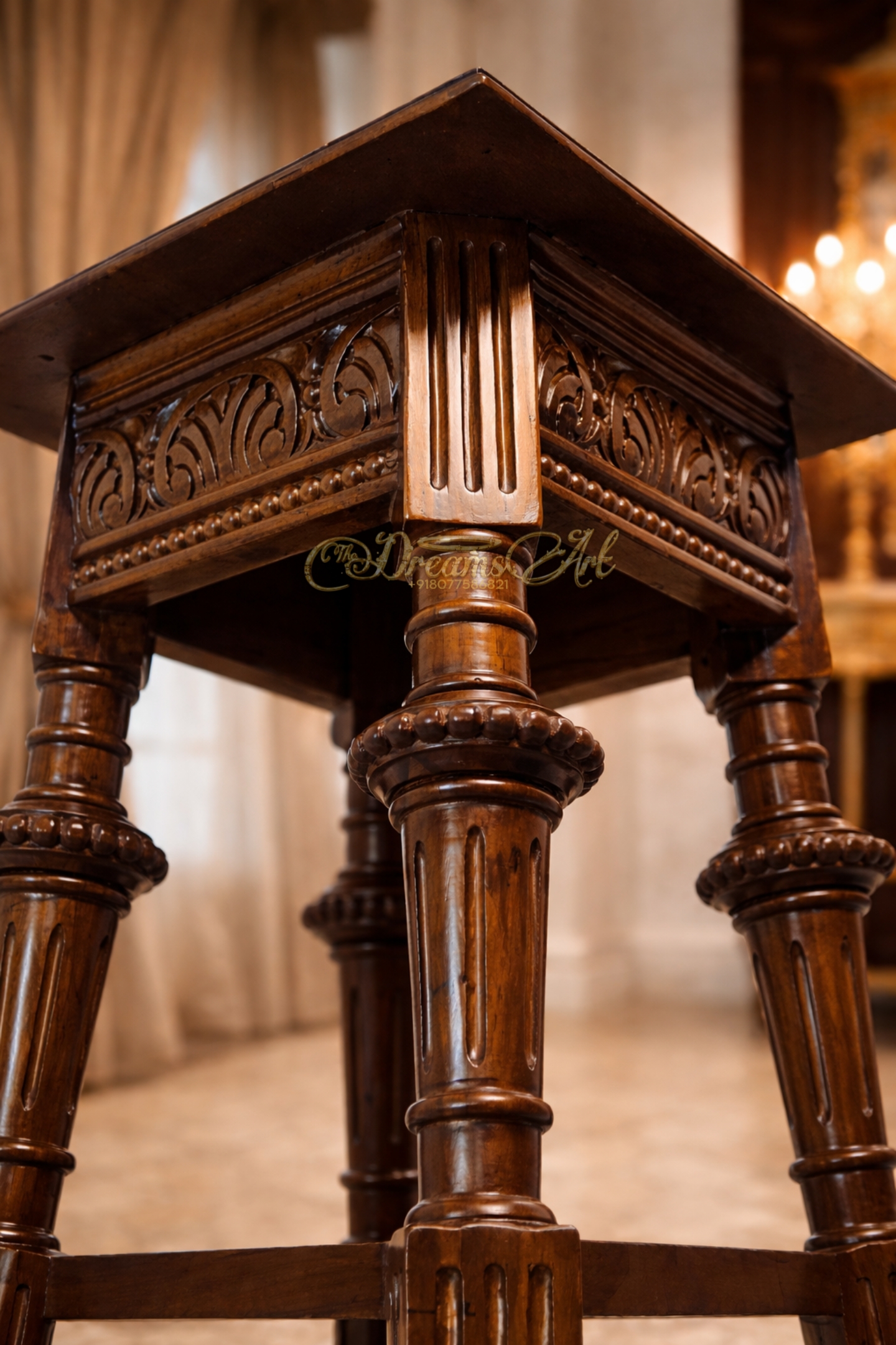Introducing The Windsor Heritage Hand-Carved Wooden Stool, a beautifully proportioned accent piece inspired by classical European and royal Indian design. Expertly handcrafted from premium solid wood by skilled Saharanpur artisans, this stool features elegant panel carvings, turned legs with bead detailing, and a refined square top finished with a rich, lustrous polish.